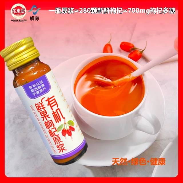 甄选有机道地枸杞原料,天然绿色健康,不加一滴水,液态小分子更易消化吸收。